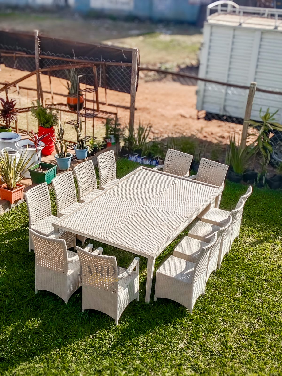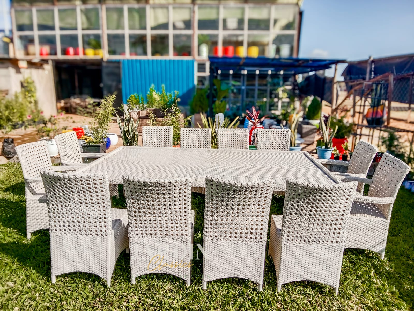 Expansive Hosting Capacity: Features a magnificent oversized rectangular table and twelve masterfully woven chairs, ensuring every guest has a seat at the table in total comfort.
