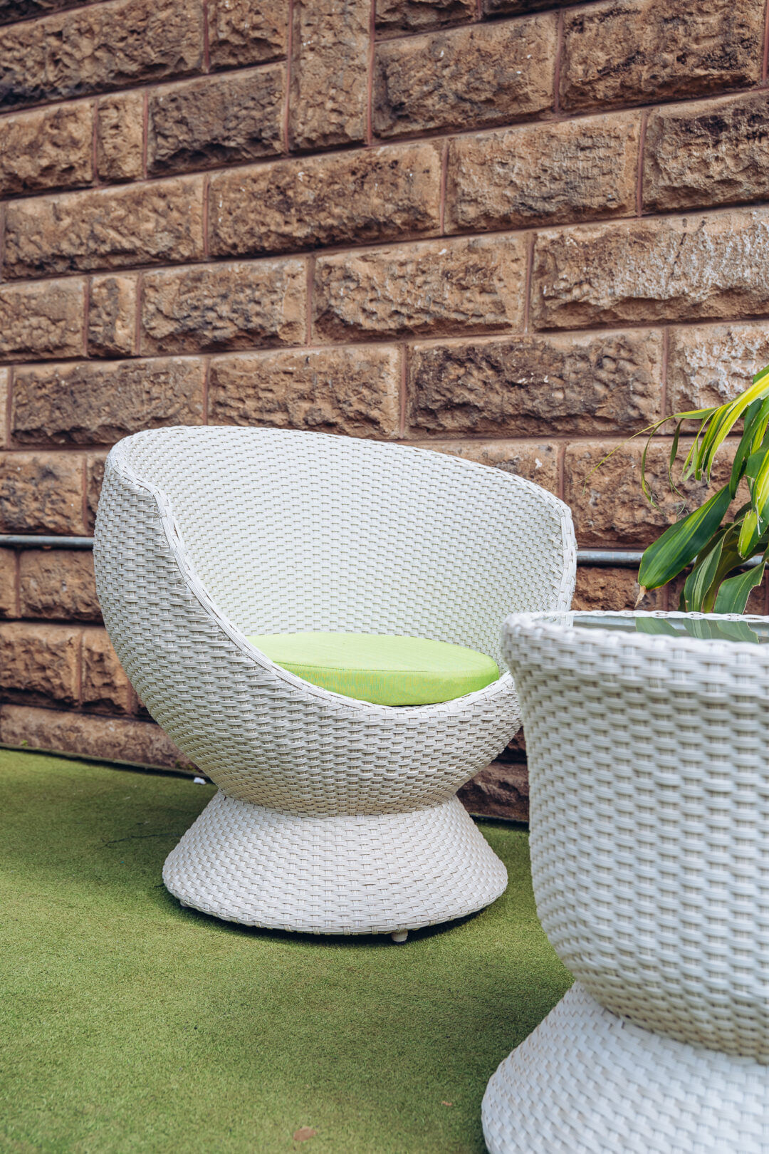 The Begonia seat set redefines contemporary outdoor comfort with its bold curves and eye-catching silhouette. Designed for modern patios, balconies, and garden corners, this chic three-piece set includes two uniquely rounded rattan chairs with pedestal bases and a matching center table. The crisp white finish is beautifully complemented by fresh green seat cushions, giving your space a lively yet sophisticated look.
