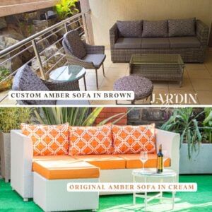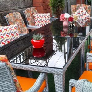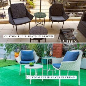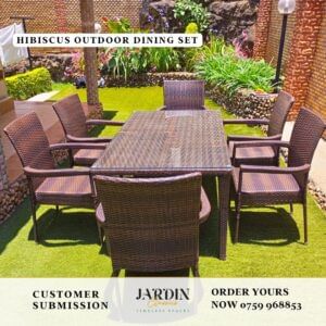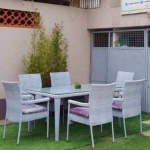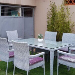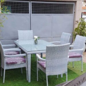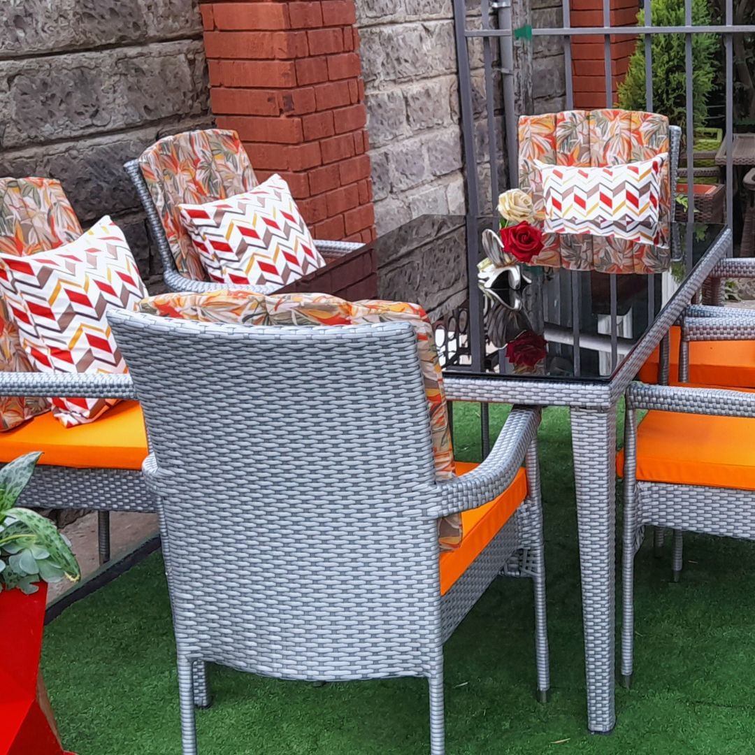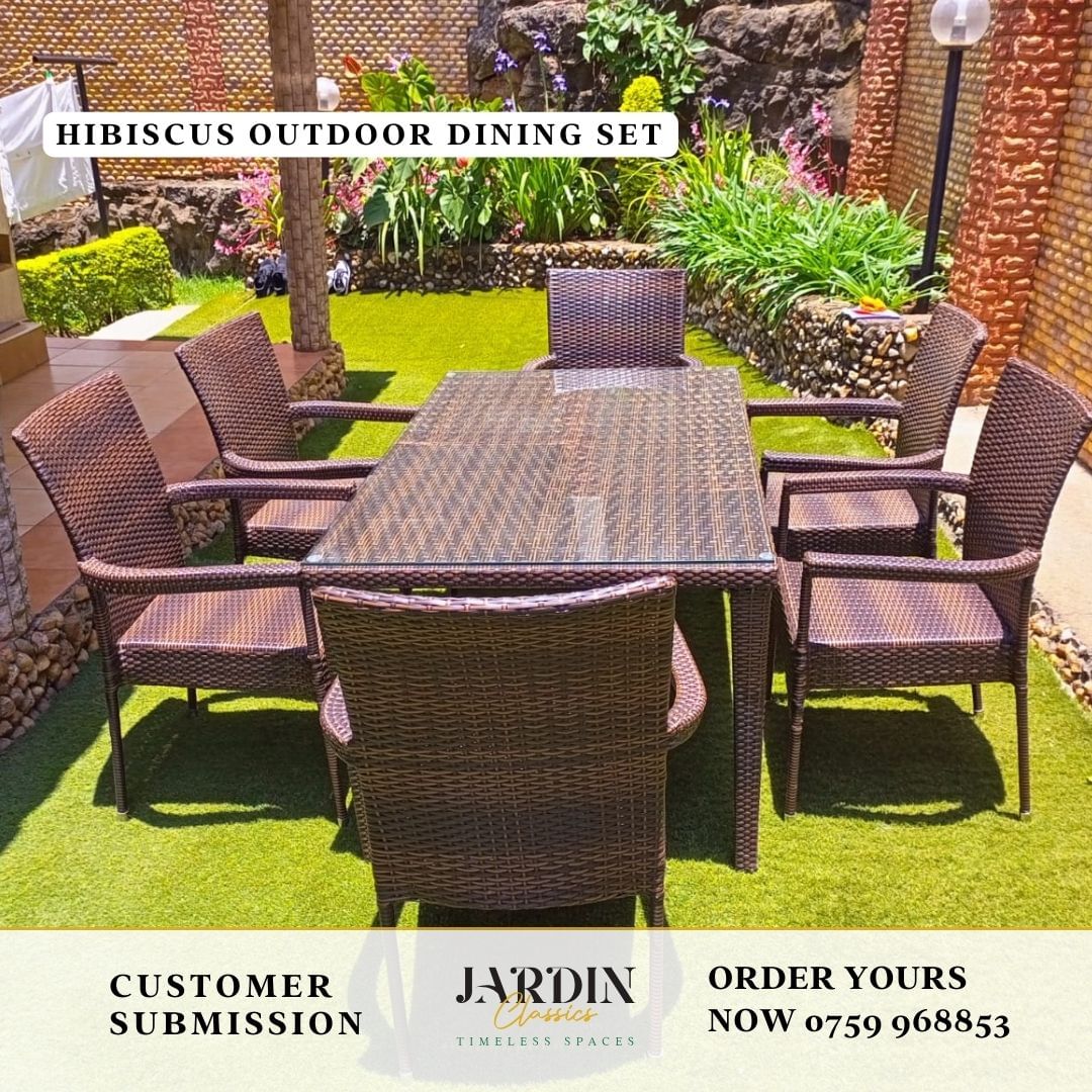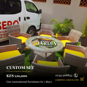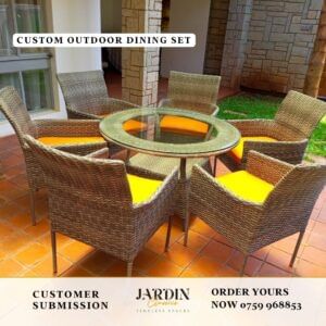 Enhance your outdoor living space with this beautifully customized dining set from Jardin Classics. Featuring six woven rattan armchairs with vibrant yellow cushions and a round glass-top table, this set is designed for both style and comfort. Perfect for garden gatherings, patio dinners, or relaxing weekends, each piece is crafted for durability and weather resistance.