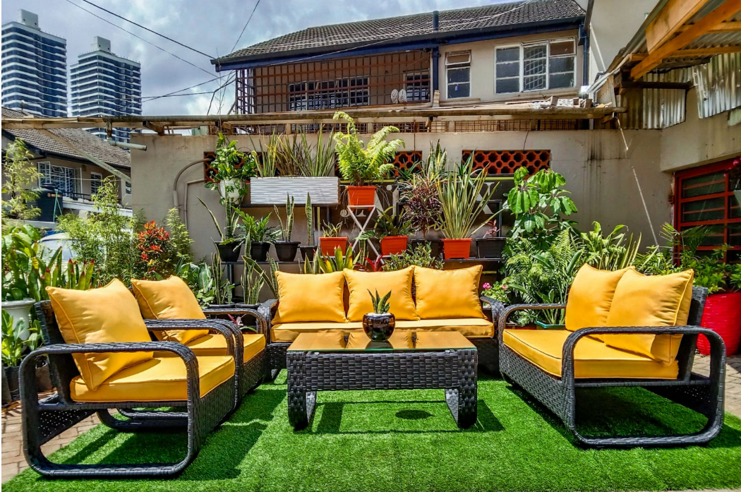 Add a splash of color and contemporary flair to your outdoor space with the Heather seat set. This striking four-piece ensemble includes a spacious three-seater sofa, two low-profile armchairs, a two-seater sofa and a sturdy rectangular glass-top table. The curved armrest design offers a modern touch, while the bright yellow cushions breathe energy and personality into any patio, balcony, or garden.