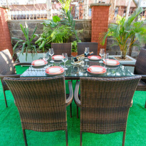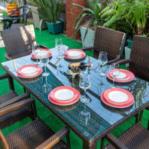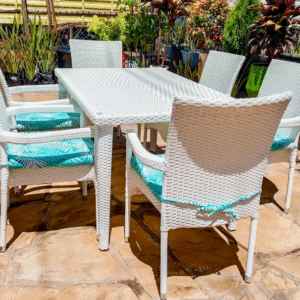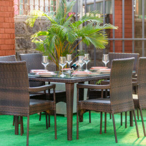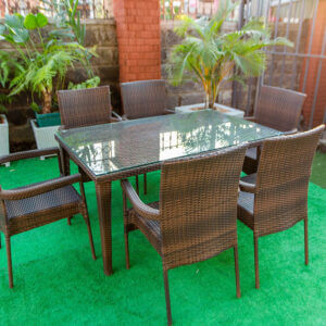 Dine in style with the Hibiscus Outdoor Dining Set, a beautifully designed 7-piece rattan set that brings elegance, comfort, and functionality to your garden, patio, or terrace. This set includes six high-back rattan armchairs and a spacious rectangular glass-top dining table—perfect for entertaining guests or enjoying family meals under the open sky.