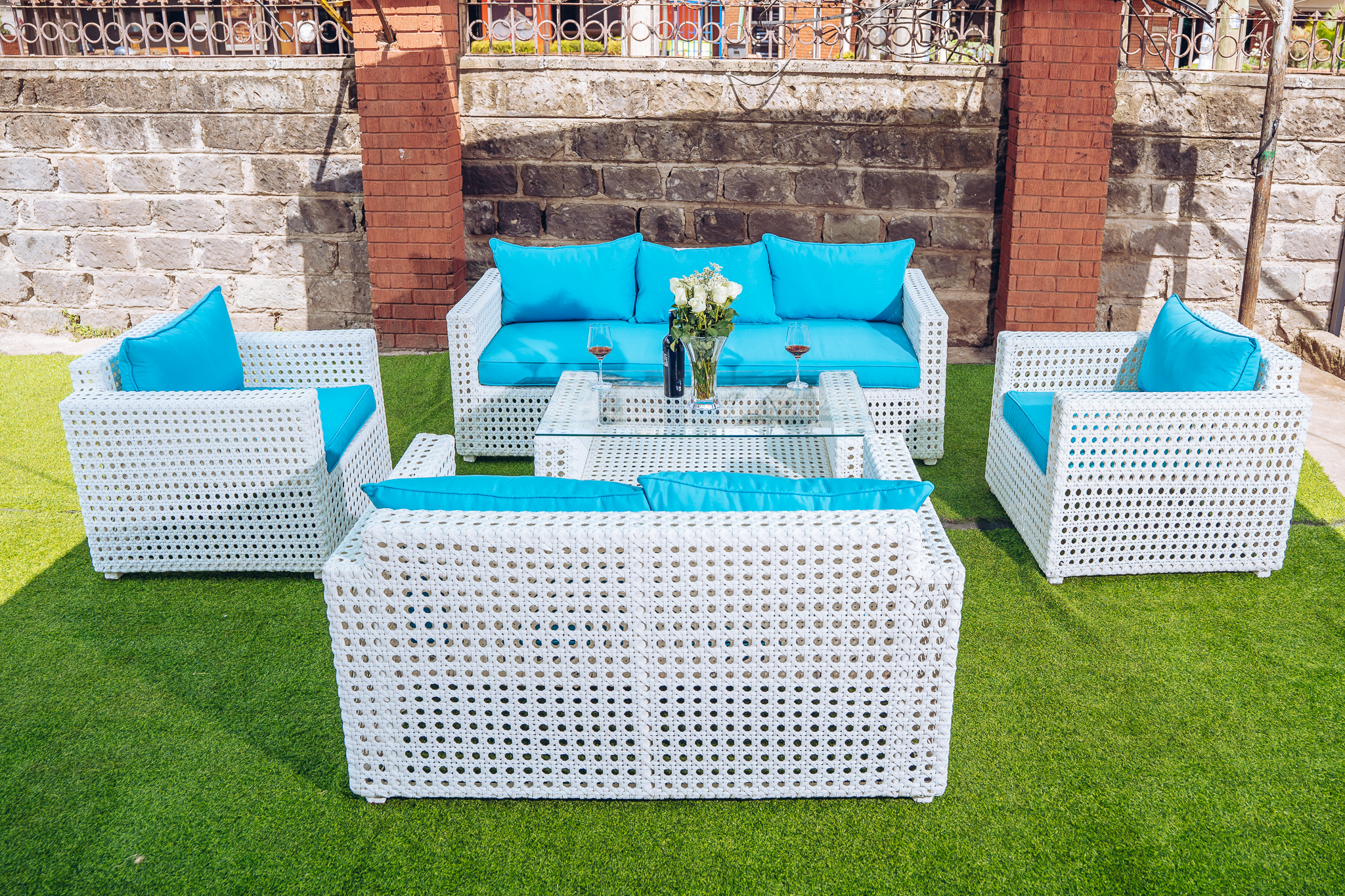 The Jas seat set pairs bold white wicker frames with vibrant blue cushions—perfect for stylish, comfortable outdoor lounging or entertaining.
