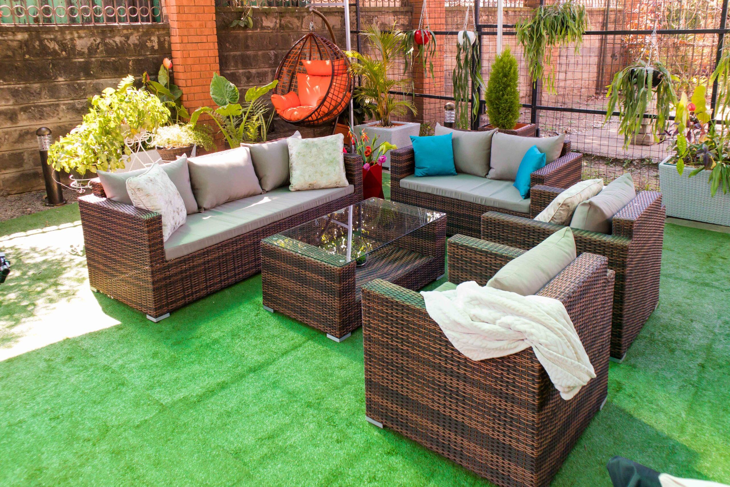 Brighten up your outdoor space with the Jasmine Outdoor Sofa Set, a stylish 7-seater ensemble designed for comfort and charm. Featuring two armchairs, two three-seater sofas, and a sleek glass-top coffee table, this set is perfect for relaxing, entertaining, or enjoying the sunshine with friends and family.