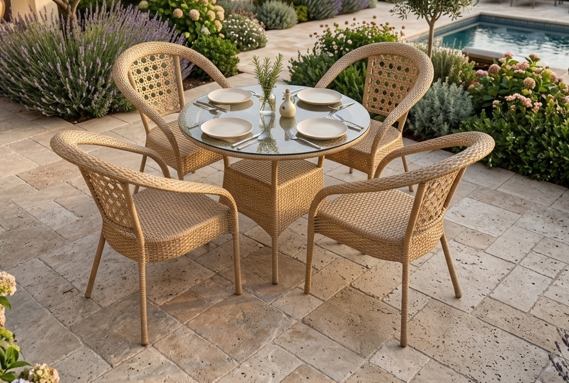 Elevate your garden with the Rosemary 4-Seater Rattan Dining Set. Featuring a unique open-weave design and glass-top table, it’s the ultimate upgrade for your outdoors.